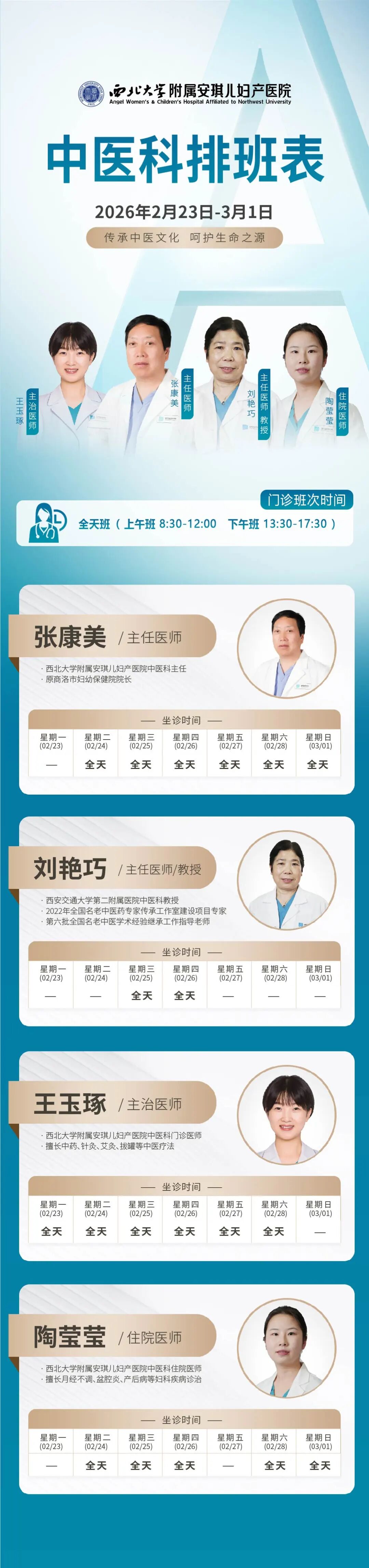 西安安琪儿妇产医院(2月23日至3月1日)专家坐诊时间表